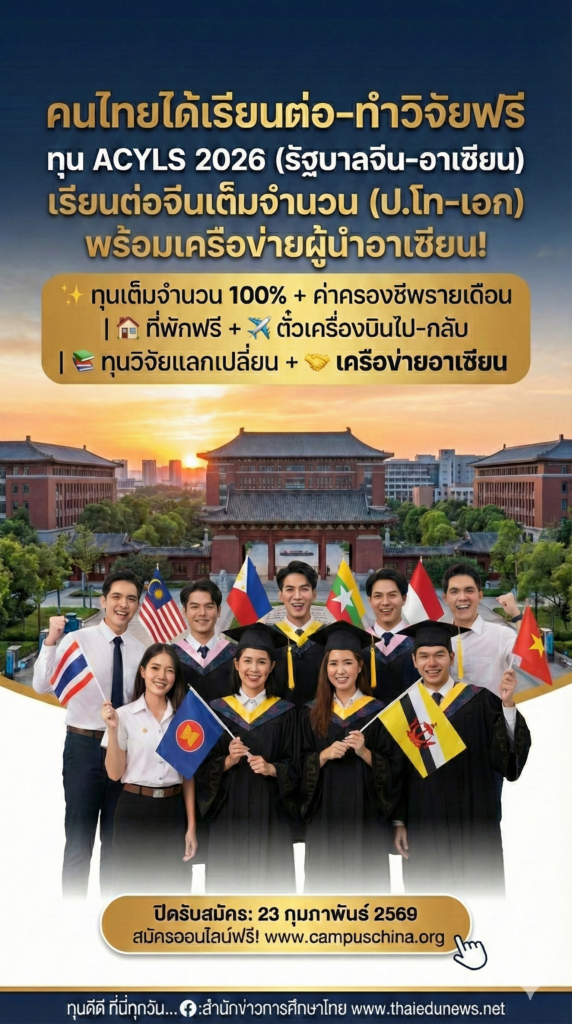 ในการนี้ สำนักงานปลัดกระทรวงศึกษาธิการ ในฐานะผู้ประสานงานของโครงการทุนการศึกษา ACYLS ของประเทศไทย ขอประชาสัมพันธ์โครงการทุนการศึกษา ASEAN-China Young Leaders Scholarship Programme (ACYLS) ประจำปี 2026 และเชิญชวนผู้สนใจที่มีคุณสมบัติตามเกณฑ์สมัครเข้ารับทุนการศึกษาในโครงการดังกล่าว