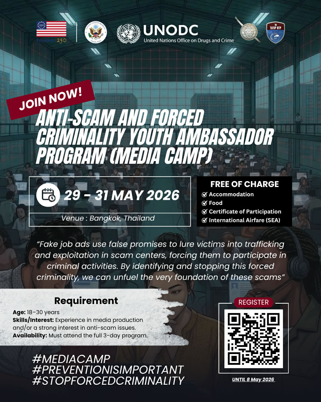 สถานทูตสหรัฐฯ ร่วมกับสำนักงานตำรวจแห่งชาติ ขอเชิญชวนเยาวชนอายุ 18–30 ปี สมัครเข้าร่วมโครงการ Anti-Scam and Forced Criminality Youth Ambassador Program ภายใต้ Alumni Engagement Innovation Fund (AEIF) เพื่อช่วยกันปกป้องสังคมของเราจากการฉ้อโกงทางออนไลน์