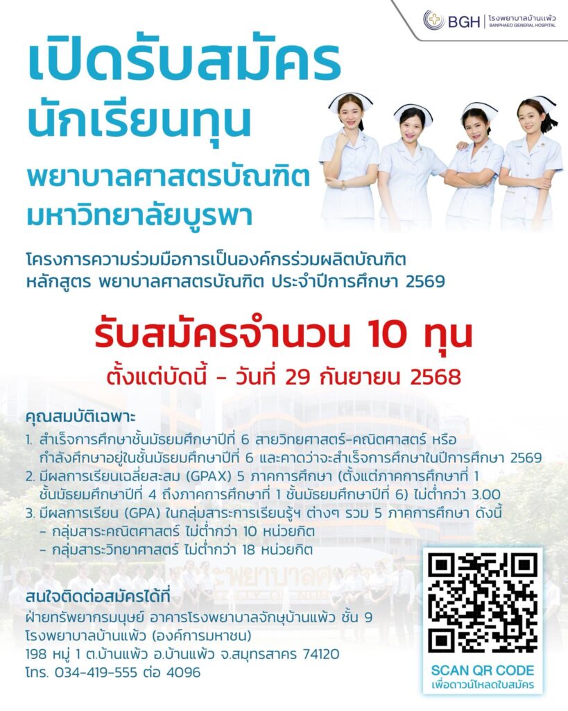 โรงพยาบาลบ้านแพ้ว (องค์การมหาชน) เปิดรับสมัครนักเรียนทุนพยาบาลศาสตรบัณฑิต (มหาวิทยาลัยบูรพา)