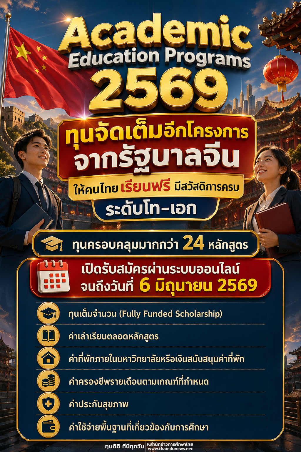 สำนักข่าวการศึกษาไทย – โอกาสสำคัญสำหรับบุคลากรภาครัฐไทยที่ต้องการพัฒนาศักยภาพและเปิดโลกการเรียนรู้ในระดับนานาชาติ ล่าสุด กรมความร่วมมือระหว่างประเทศ เปิดเผยว่า สาธารณรัฐประชาชนจีน โดยหน่วยงานภายใต้ กระทรวงพาณิชย์ของจีน ได้เสนอทุนการศึกษาให้แก่รัฐบาลไทย ภายใต้โครงการ Academic Education Programs ประจำปีการศึกษา 2569 เพื่อคัดเลือกบุคลากรภาครัฐเข้าศึกษาต่อในระดับปริญญาโทและปริญญาเอกในมหาวิทยาลัยและสถาบันชั้นนำของจีน
