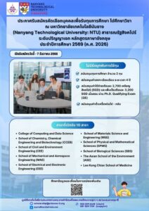 📣 ️ ประชาสัมพันธ์ “ทุนการศึกษาพระราชทาน เพื่อไปศึกษาวิชา ระดับปริญญาเอก หลักสูตรภาษาอังกฤษ ณ มหาวิทยาลัยเทคโนโลยีนันยาง (Nanyang Technological University: NTU) ประจำปีการศึกษา 2569 ประเทศสิงคโปร์” โดยไม่มีข้อผูกพันการใช้ทุน