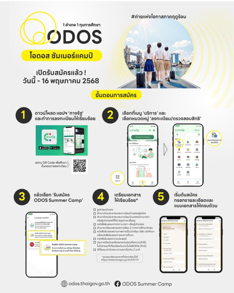 ทั้งนี้ ขอยืนยันกับ น้อง ๆ เยาวชน ตลอดจนผู้ปกครองว่า โครงการดังกล่าว ไม่มีการเรียกรับค่าใช้จ่ายหรือค่าธรรมเนียมใด ๆ ในการสมัครและเข้าร่วมโครงการ รวมทั้งไม่มีนโยบายให้เจ้าหน้าที่ติดต่อ หรือโทรหาผู้สมัครหรือบุคคลในครอบครัวผู้สมัครทุกกรณี โดยโครงการ ODOS Summer Camp จะมอบทุนการศึกษา “แบบให้เปล่า” แก่ผู้ที่ผ่านการคัดเลือกเข้าร่วมโครงการรวม 928 ทุน (878 อำเภอทั่วประเทศ และ 50 เขตในกรุงเทพมหานคร) โดยรัฐบาลจะเป็นผู้สนับสนุนค่าใช้จ่ายทั้งหมดในอัตราเดียวกันกับนักเรียนทุนรัฐบาล