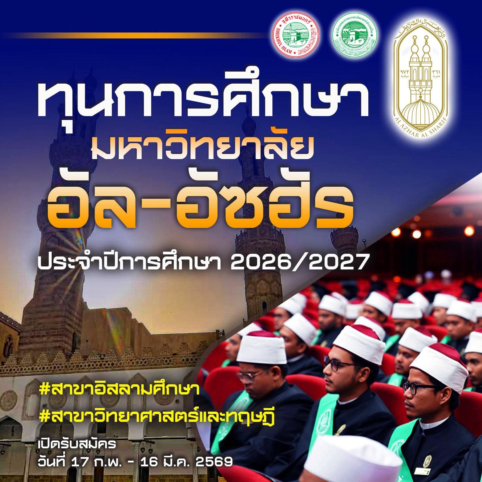 มหาวิทยาลัยอัลอัซฮัร มอบทุนการศึกษาแก่นักศึกษาจากประเทศไทย จำนวน 160 ทุน ในปีการศึกษา 2026/2027 (2569/2570)